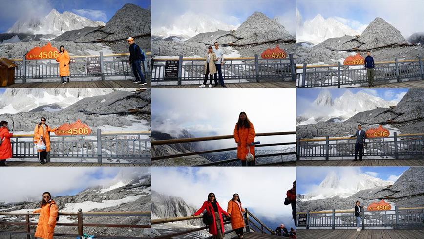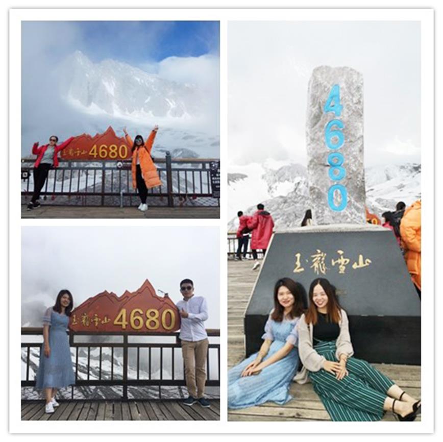 可是4506并不是我們的終點,我們一直會要前行,都在向那個迎風飄揚的鮮艷紅旗的高點進發。在補足氧氣后,一口氣爬上那一道木梯,緊張小心地呼吸著這頂峰間稀薄的空氣然后在夢開始的地方,我們重新集結,在神圣美麗的玉龍雪山上,留下了我們淺淺甜甜的笑。之后的下山索道卻顯得異常的快,身后的景色抓不住,卻也放不下。
