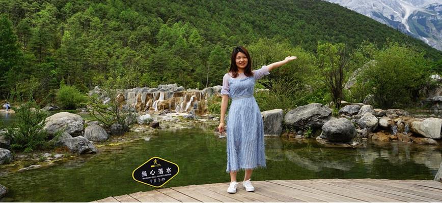 在納西族胖金妹的介紹下,我們瞻仰朝拜了玉龍雪山。之后便沿著雪水流淌的方向,踱步欣賞,定格抓拍,好似要把整個藍月谷打包帶走。胖金妹還教了我們幾句納西語,中文“謝謝”在納西語里叫jiu bai she(九百歲),“再見”在納西語里叫lei duo duo(淚多多)。后來我們說著“淚多多”跟胖金妹告別。